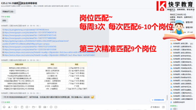 更让陈同学安心的是快学的智能岗位匹配服务——每周推送3次岗位,每次6-10个精准选项,从网申截止时间到岗位专业要求都标注得清清楚楚。“第一次匹配就给了8个岗位,有上海水产集团的信息化专员、宁波中远海运的供应链管理岗,完全贴合我的专业和地域需求;第二次11个、第三次9个,老师还会根据我的备考进度调整投递优先级,比如某国企招聘提前时,老师特意在群里提醒我修改简历重点,避免错过机会。”
